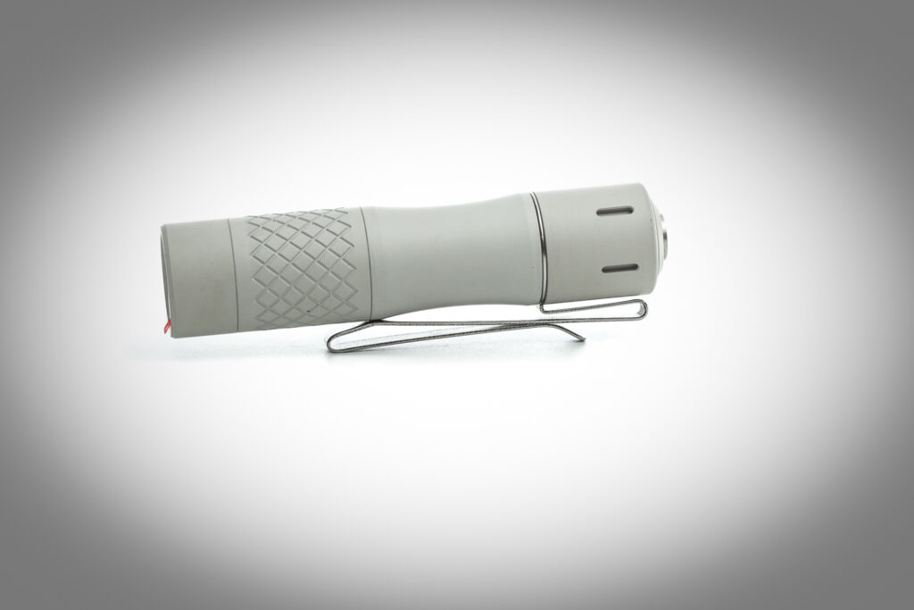 The L2 looks and feels very nice, mainly due to its white MAO (micro-arc oxidation) coating rather than its basic design. It features a protruding metal forward-clicky switch that allows momentary operation, though it takes a few milliseconds to produce light and might not respond to rapid morse coding. The tailcap has 8 small slots for glow tubes or tritium vials, and uses a metallic cover instead of rubber boot, making it a bit squeaky. The white MAO anodization looks pretty and feels less slippery than regular anodized flashlights, though it gets spots and marks more easily. The deep-carry pocket clip functions as an anti-roll feature, and the light is available in various materials including black aluminum, copper, and titanium options.