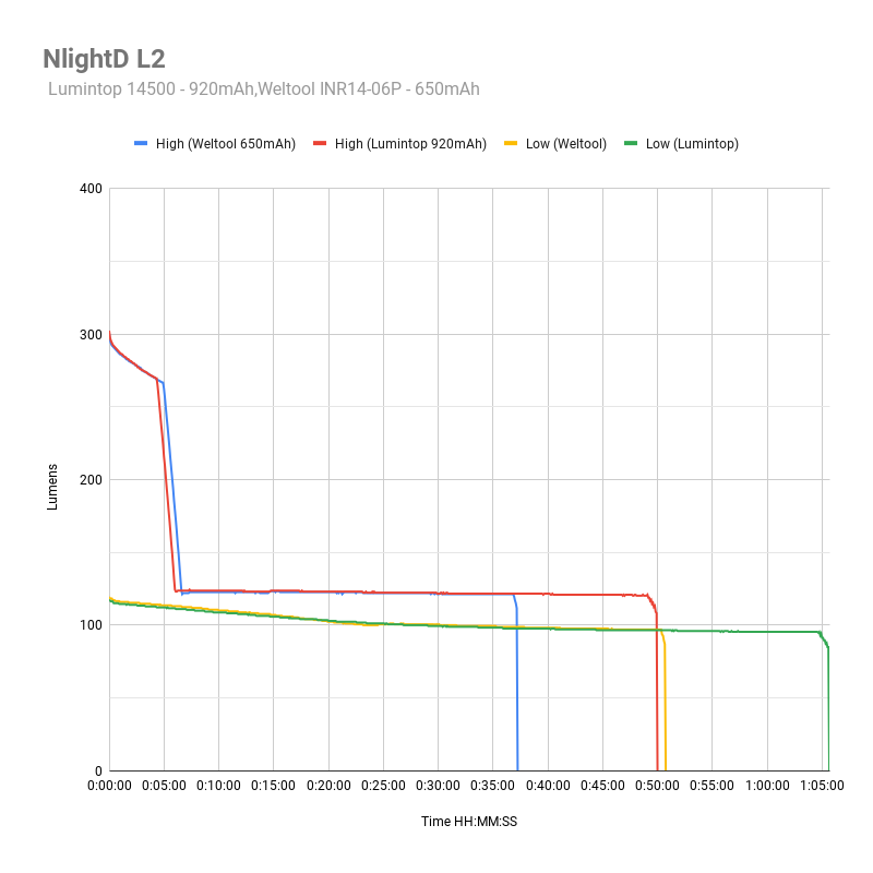 I tested the L2 with 2 different batteries, the Lumintop 14500 920mAh, and a Weltool INR14-06P. The difference between them was very small, especially in the