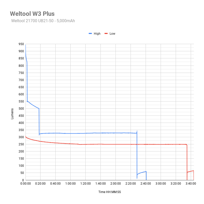 High mode ran quite a bit longer than advertised, as was also the case with the Weltool W3 Pro Tac. It ran about 1 hour longer.